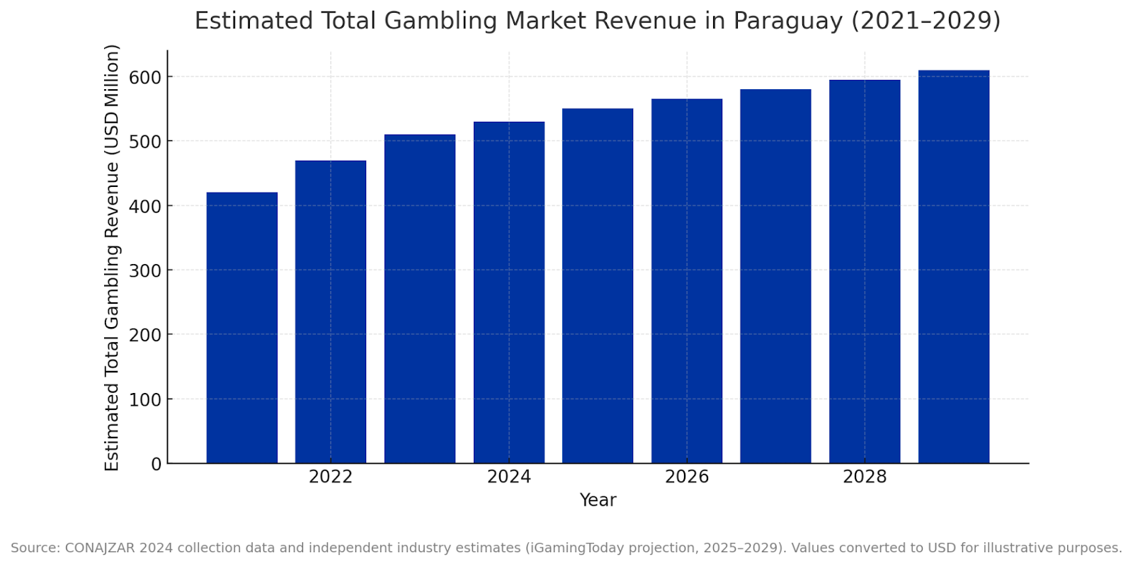 According to the Comisión Nacional de Juegos de Azar (CONAJZAR), Paraguay’s gambling sector generated PYG 175.8 billion (≈ USD 22 million) in state contributions during 2024, reflecting steady growth in regulated activity. Independent analysis further estimates total gambling revenue at around USD 550.8 million in 2025, including USD 113 million from online operations. Furthermore, sports betting, although smaller in share, is projected to grow consistently over the same period, driven by increased internet access, smartphone use, and a population with strong sporting interests.